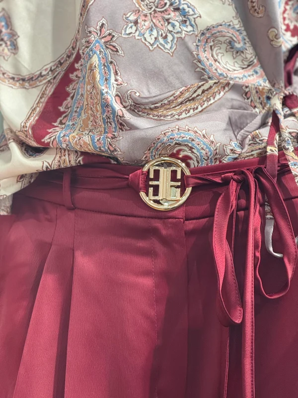 Pantalón de tiro alto confeccionado en tela satinada con acabado fluido y elegante. Presenta corte wide leg, pliegues frontales y cinturón de la misma tela para anudar a la cintura. Incorpora detalle metálico dorado en la pretina, cierre frontal con cremallera y botón metálico dorado, que aportan un toque sofisticado y chic. Ideal para looks de noche o eventos especiales.Tiene bolsillos laterales.