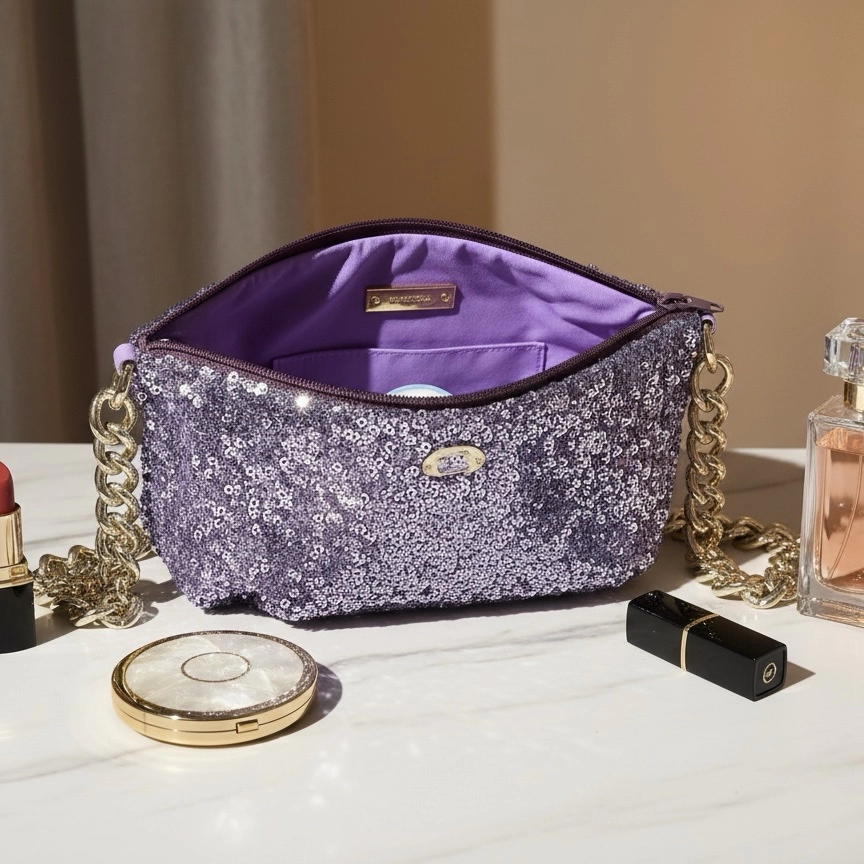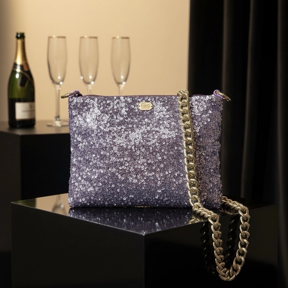 Bolso Easy Bikini italiano con lentejuelas lilas y cadena dorada. Brillante, elegante y perfecto para la noche.Blando y flexible.