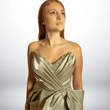 Vestido largo de fiesta en tono dorado metálico con escote cruzado adornado con piedras transparentes, con drapeado y gran lazo lateral con broche joya. La falda con abertura delantera y cola ligera aporta sensualidad y movimiento. Perfecto para bodas, galas y eventos de etiqueta.